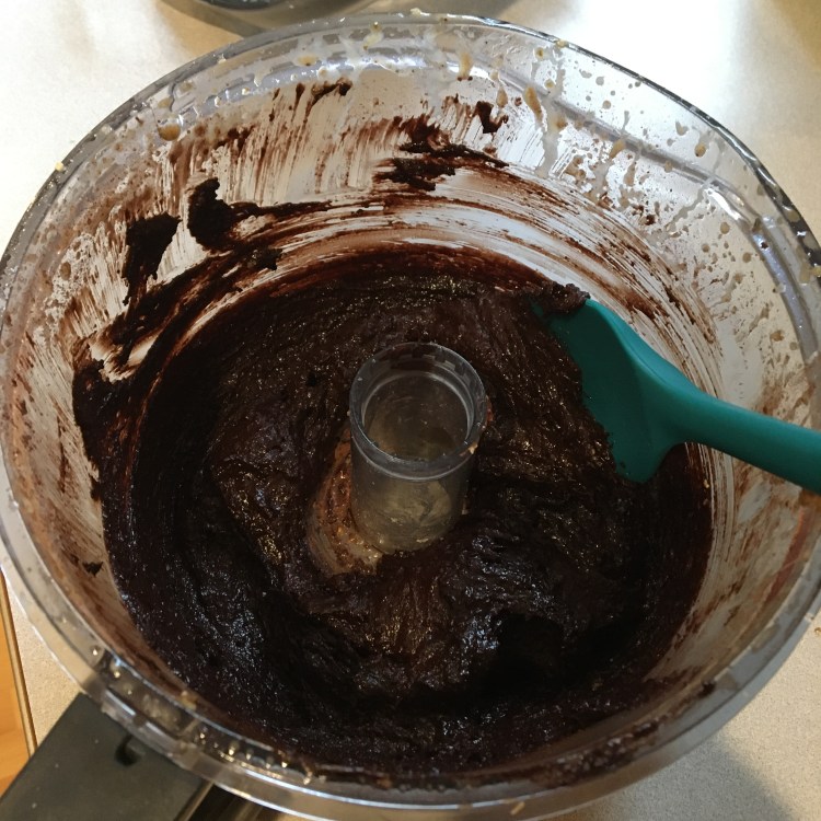 In your food processor, start with the dried pitted dates. Make sure that the pits and stems have been removed by squeezing the dates before using. Mix until the dates have broken down and started to form a sticky ball. Add eggs and olive oil and mix. Stop the food processor and add remaining ingredients except peanut butter- this comes later. Blend until just mixed. Once you remove the top of your food processor, you will need to scrap sides and stir to combine any remaining cocoa.
