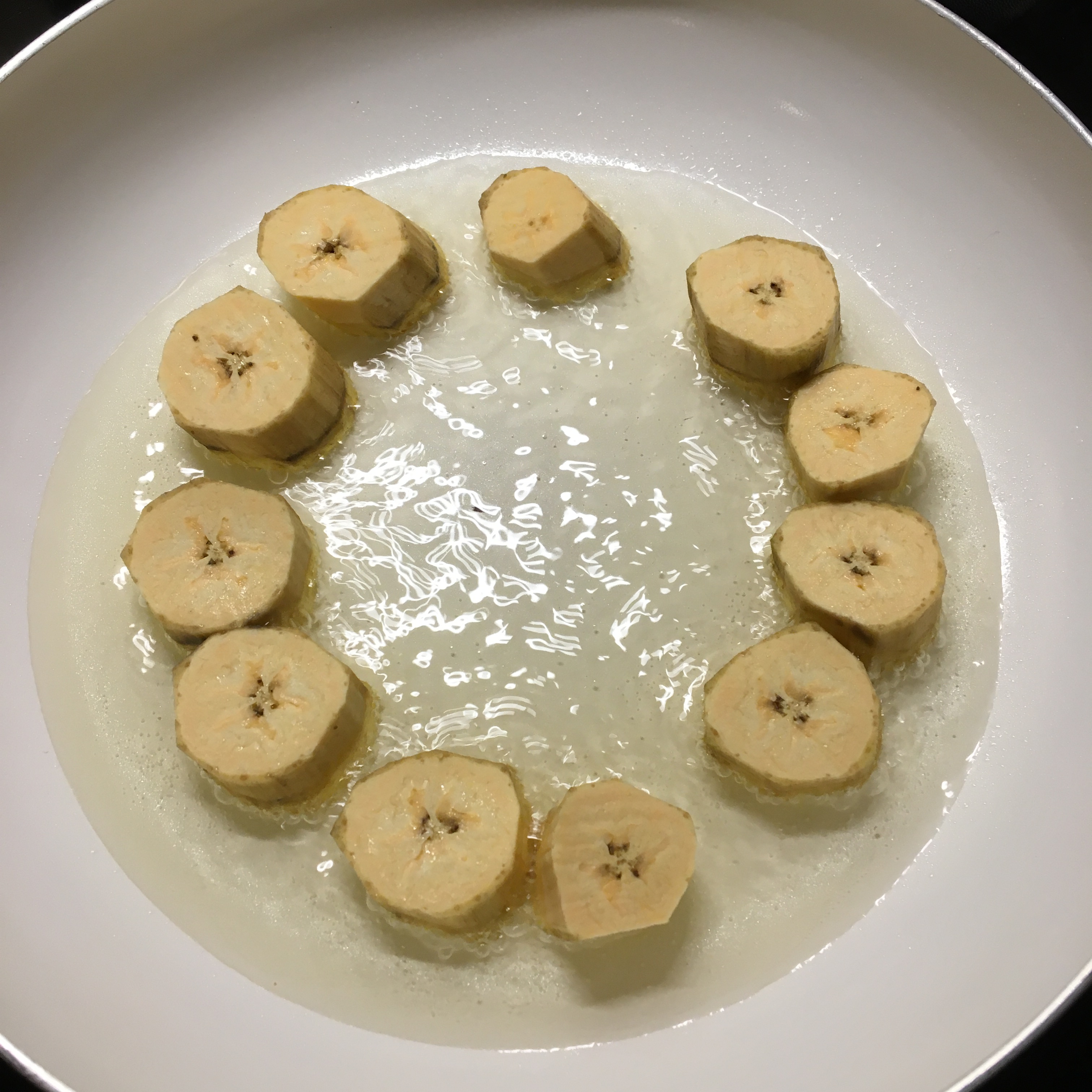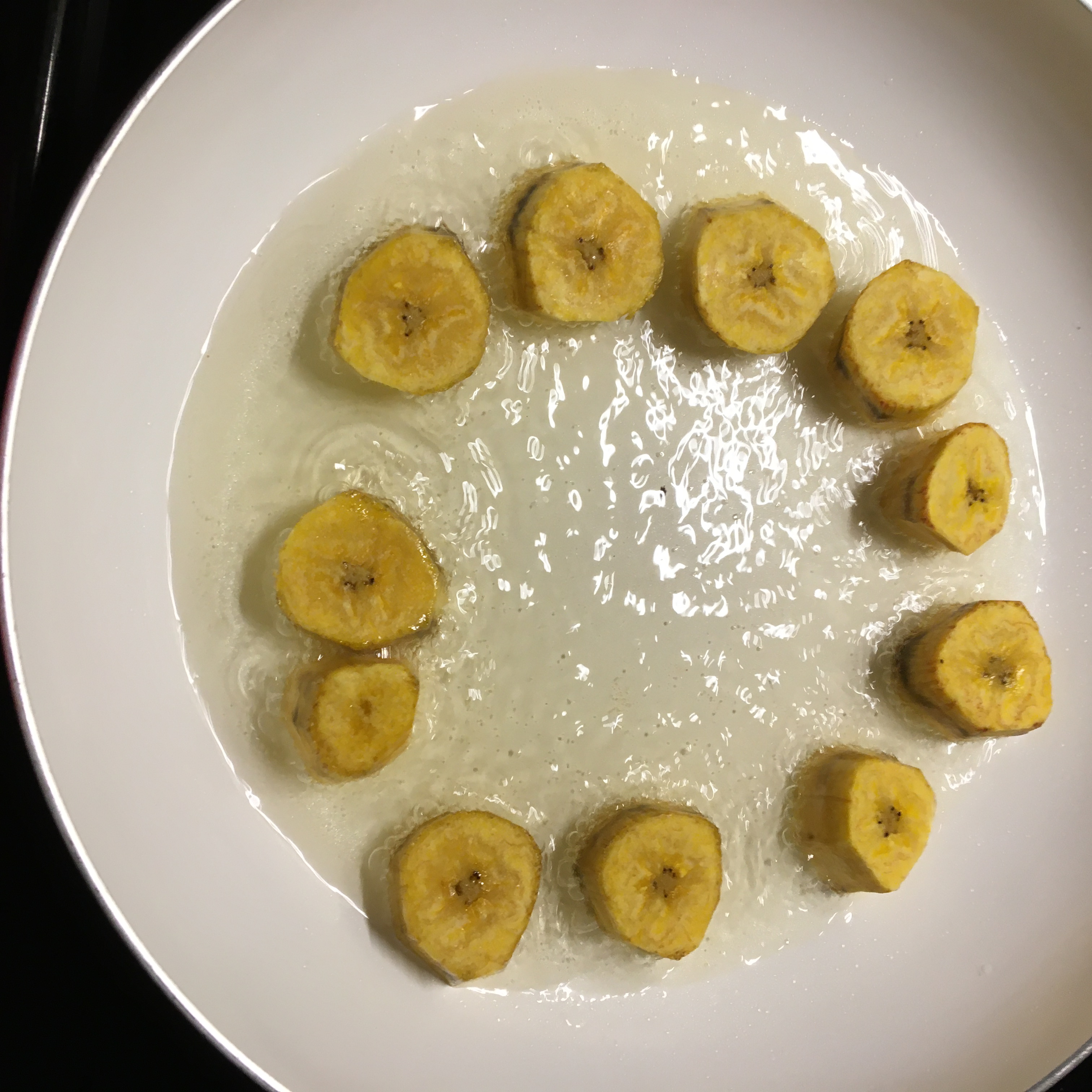 Once the plantain is back in the oil, cook until it starts to crisp, flip and cook on the other side.