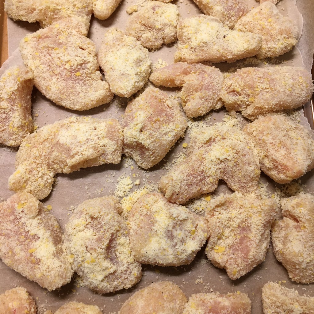 Line a baking dish or cookie sheet with parchment. Start dropping the chicken pieces into the mix 5-10 pieces at a time. Coat with the mix and set on the lined baking dish.