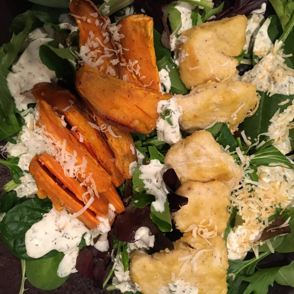 Try these with Sweet Potato Fries on top of some greens with your favorite ranch dressing and some toasted coconut.