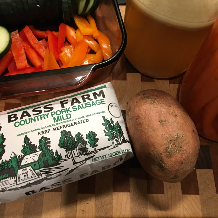 Chop sweet potato, peppers, apple and carrots leaving the skins on.