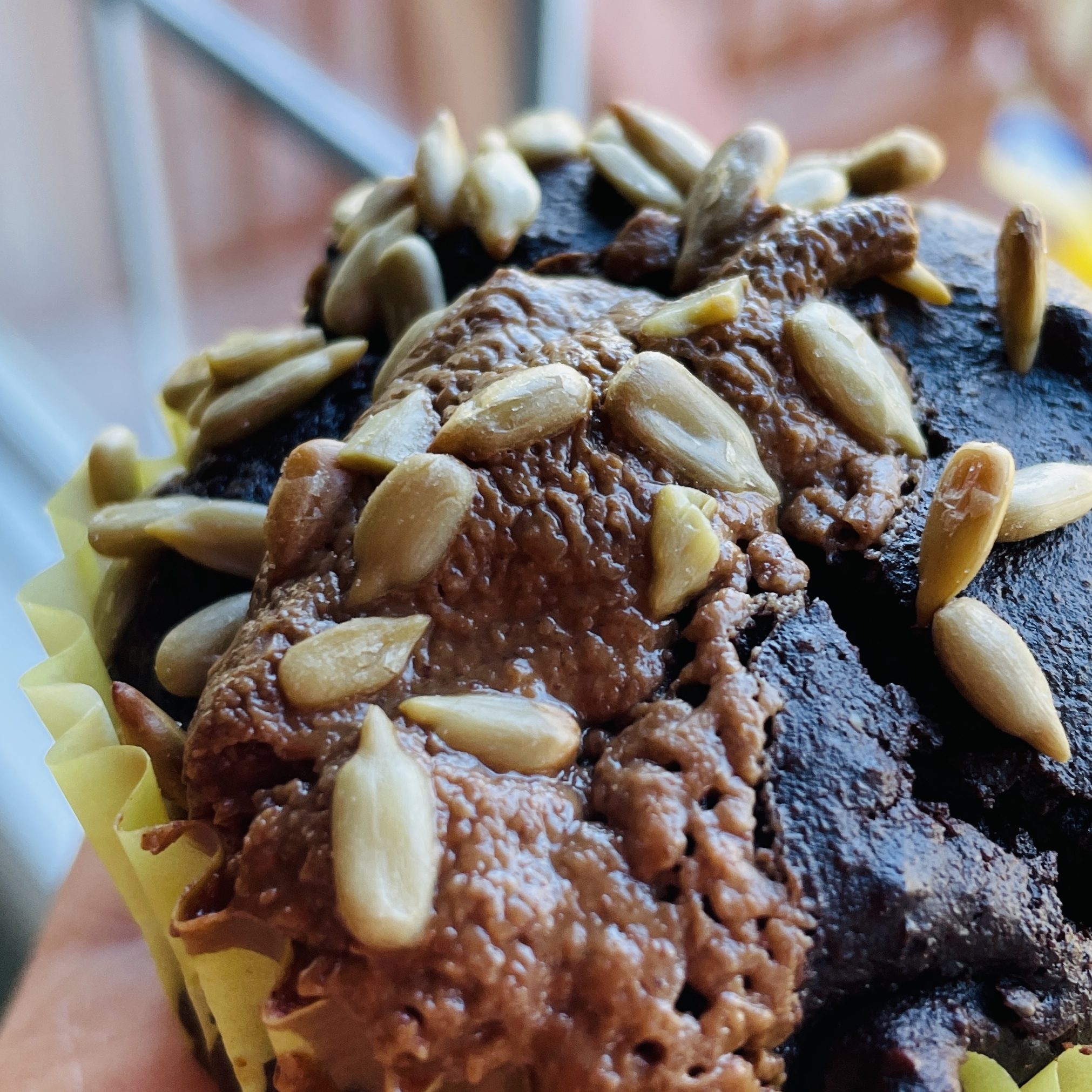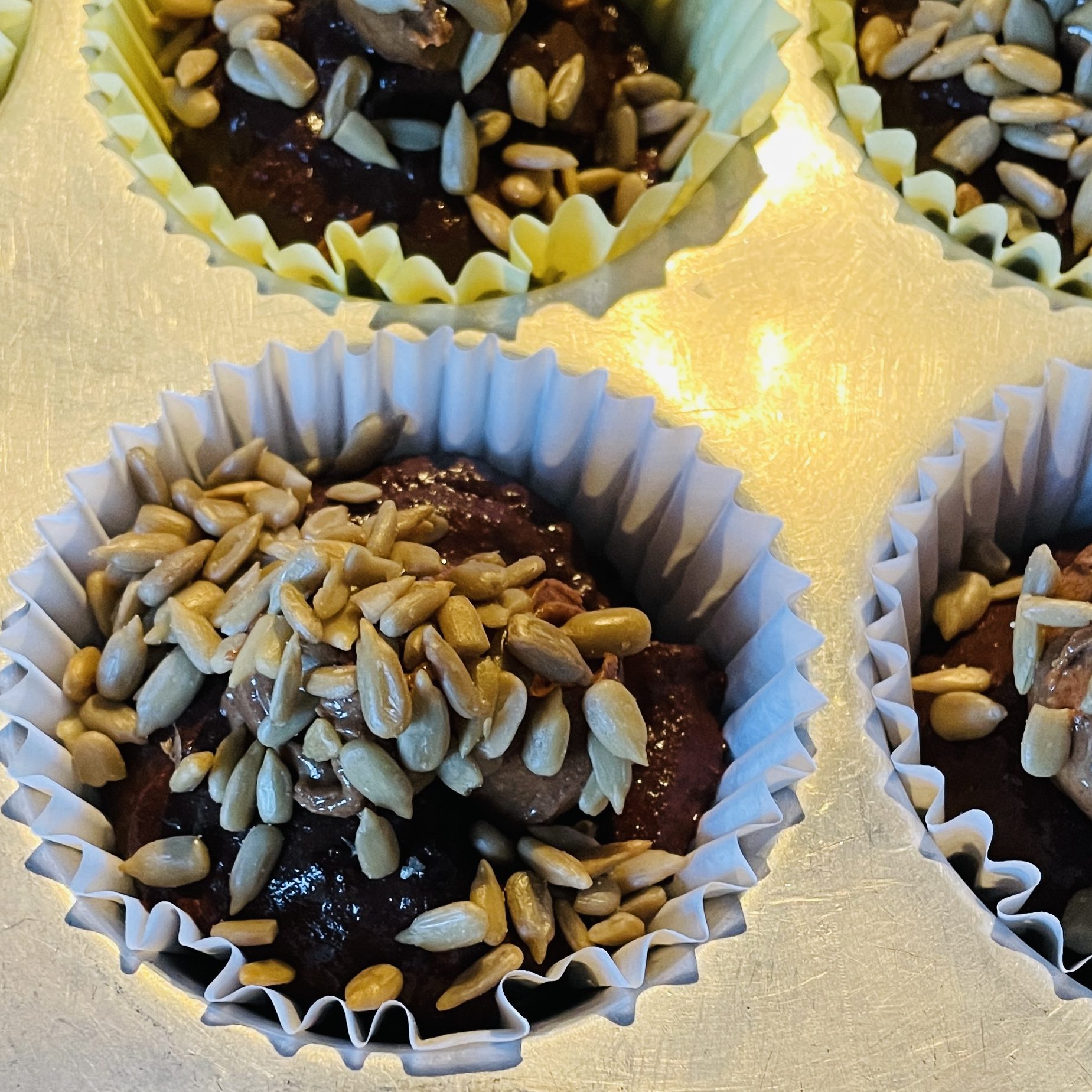 Top each muffin with 1/4 tsp dark chocolate almond butter and 1/2 tsp roasted sunflower seeds.